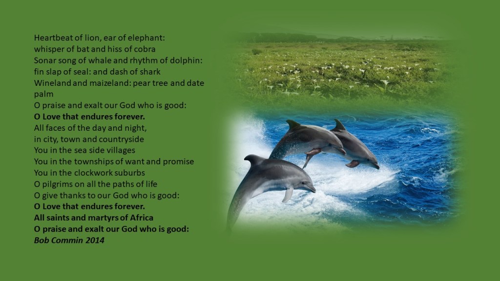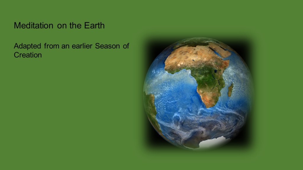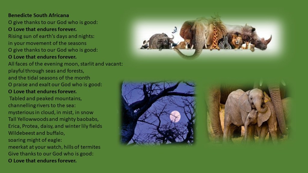 There is also a three minute Meditation on the Earth which I have adapted from a previous Season of Creation, and which I have used with young people. Do sing the chants as you catch the tune. No one will hear you. Say the prayers and reflections out loud especially the Benedicta South Africana.