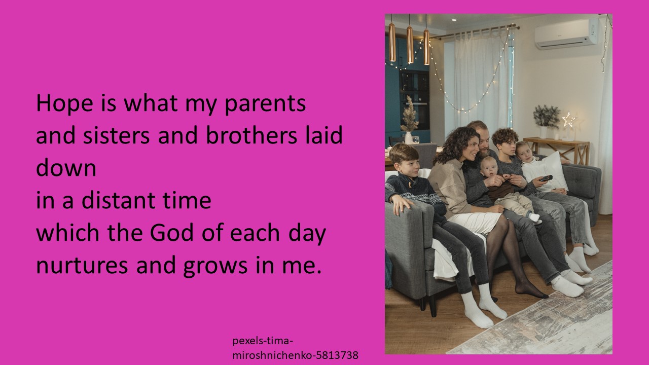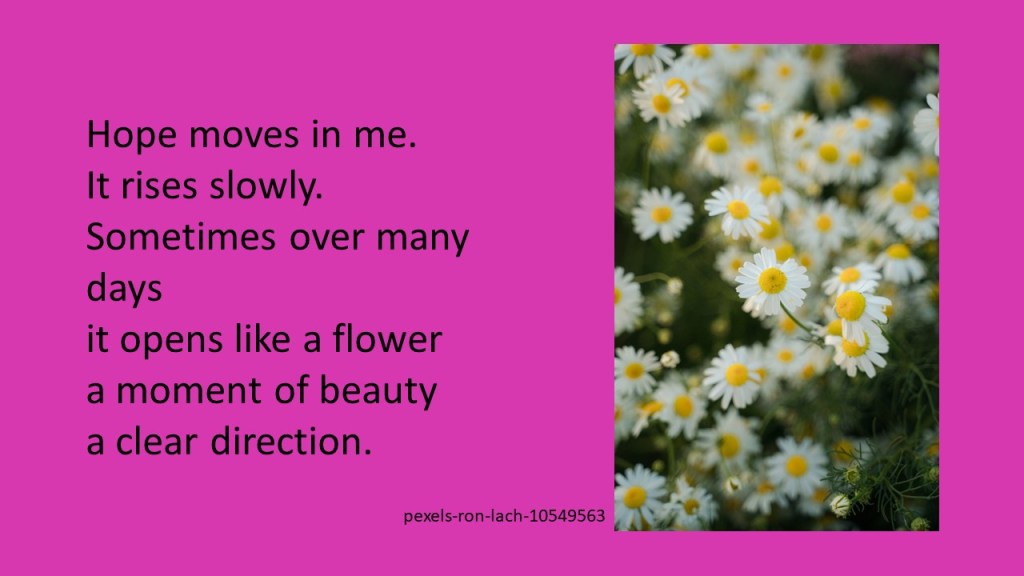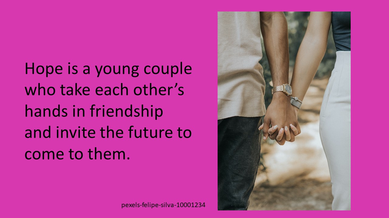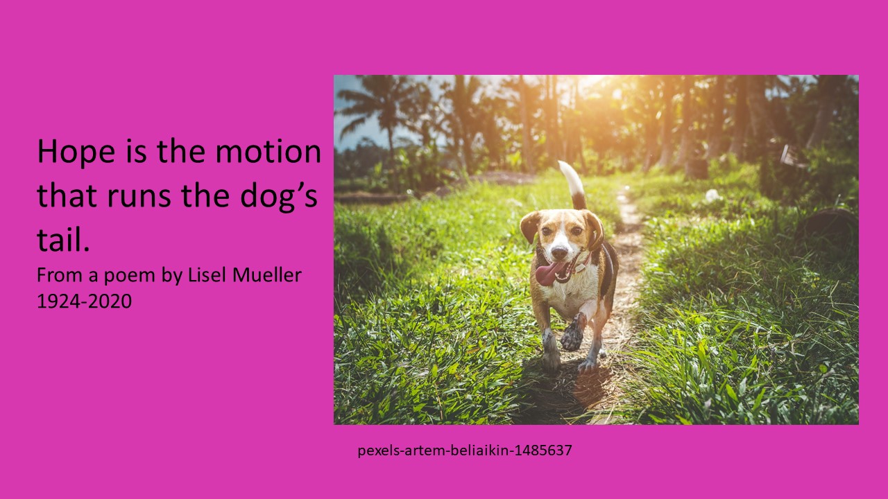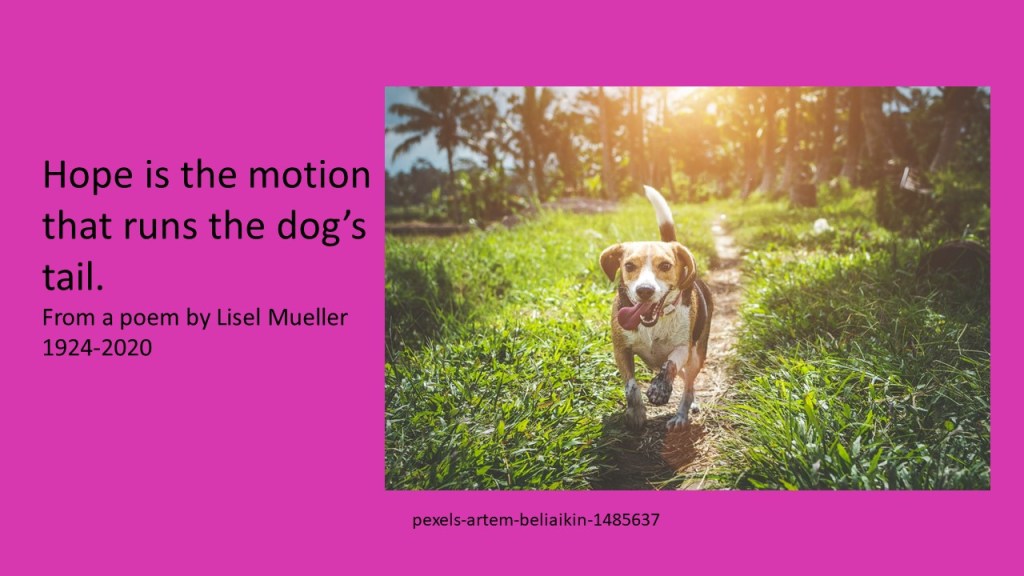 I had been working on this presentation on Hope for a few weeks running up towards Christmas. A friend of mine had sent me a poem by Lisel Mueller ( 1924-2020) on the theme of Hope. I love this line in the poem: Hope is the motion that runs the dog’s tail. This stimulated some thoughts on Hope.