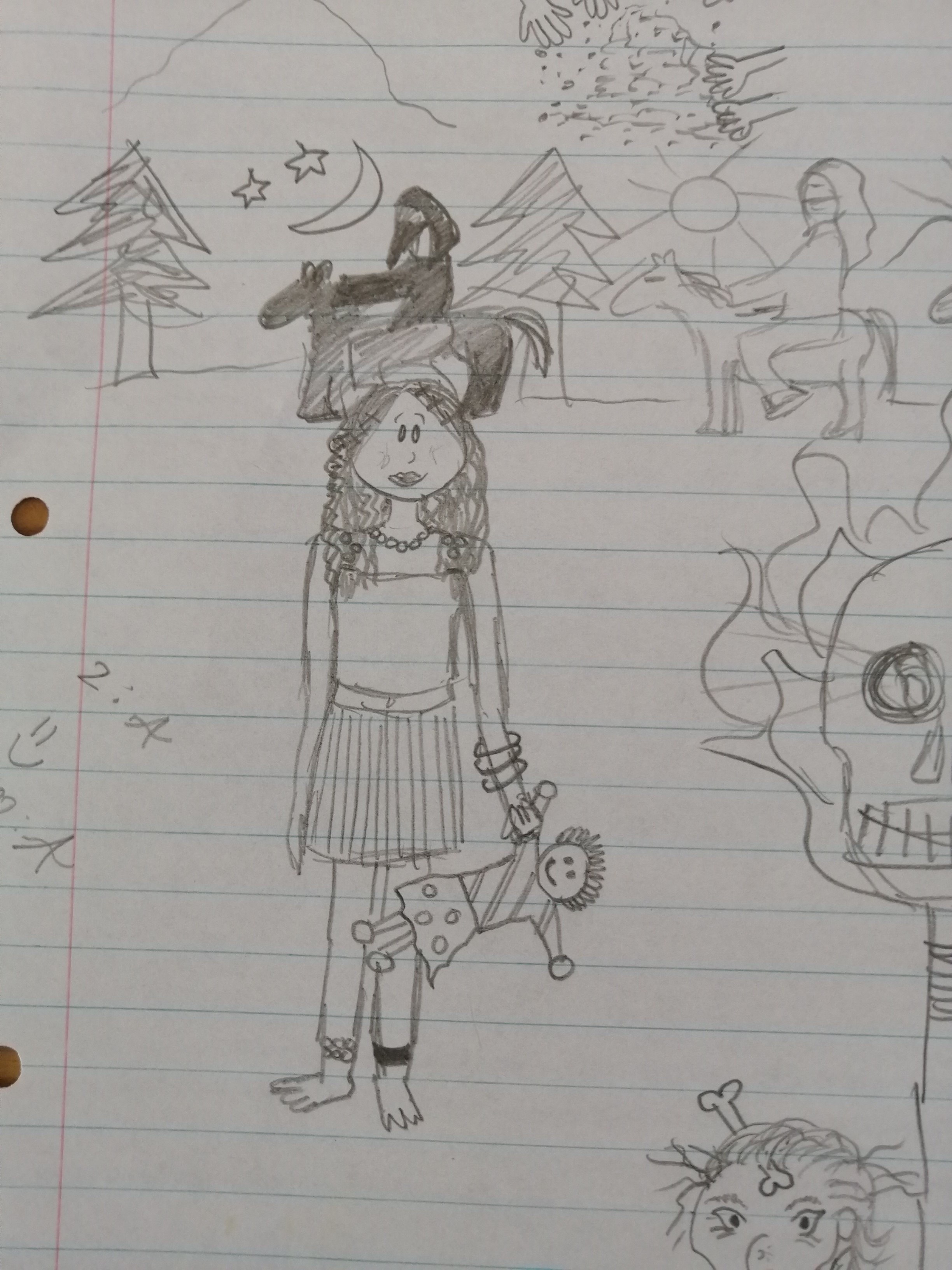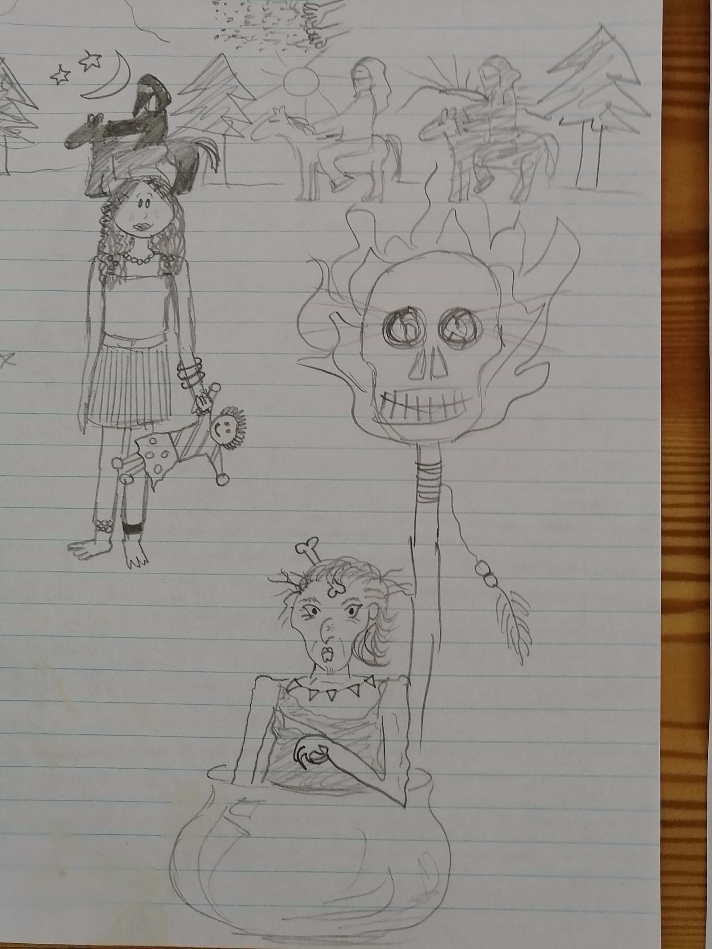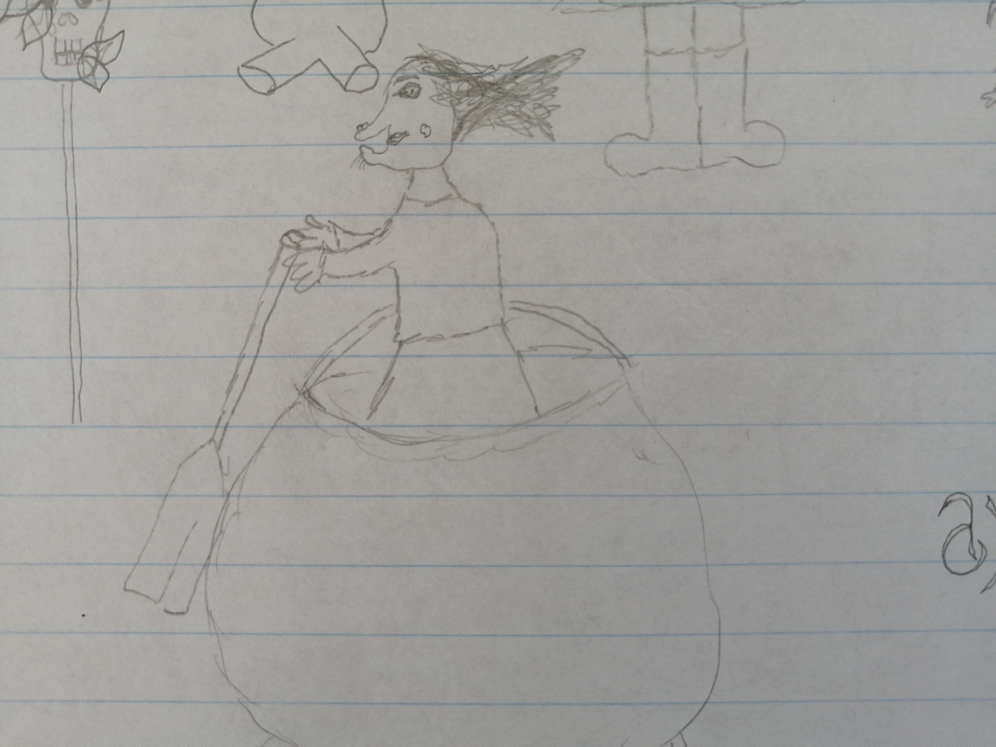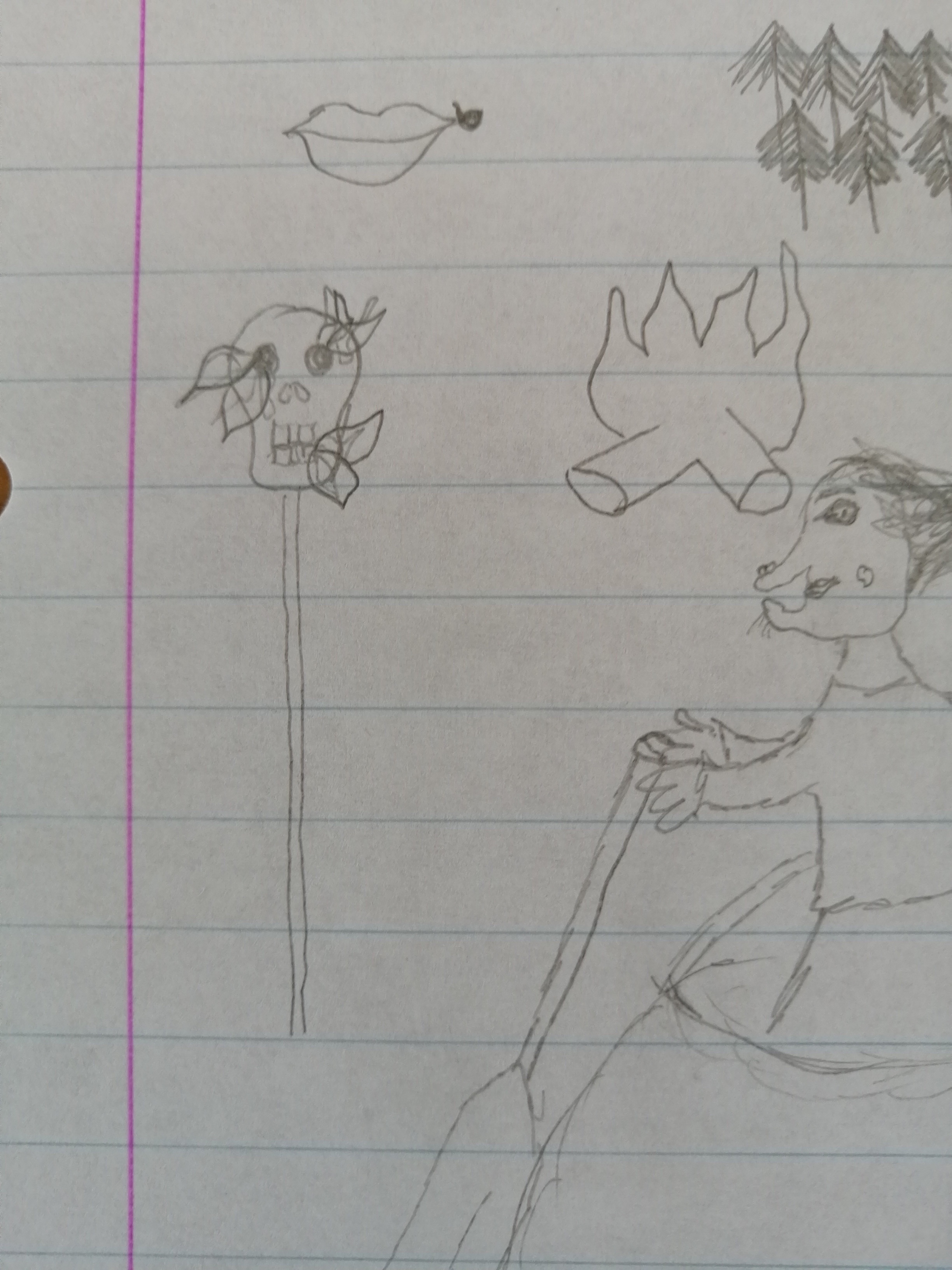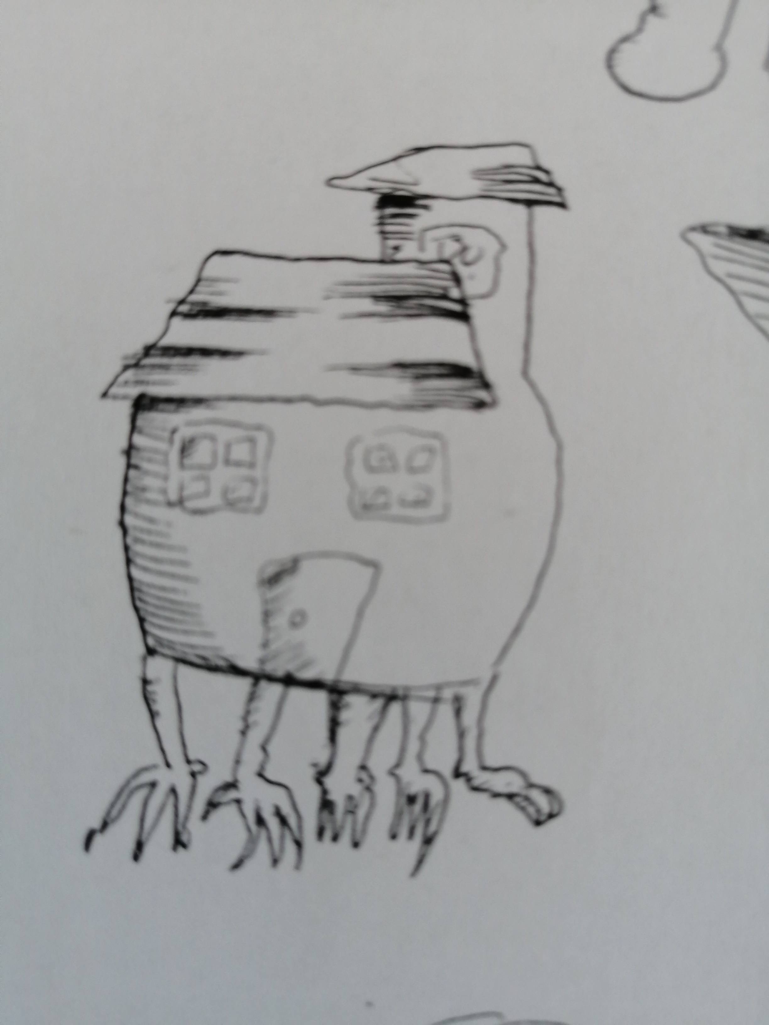 Now the Baba Yaga’s house was unlike anything she had ever seen before. The house was moving all the time and on chicken legs! The Baba Yaga had a huge nose that curved down to a goatee beard. The house was surrounded by poles with skulls on them that flamed with a fierce fire. The Baba Yaga moved around, at great speed sometimes, in a mortar with a pestle as an oar.