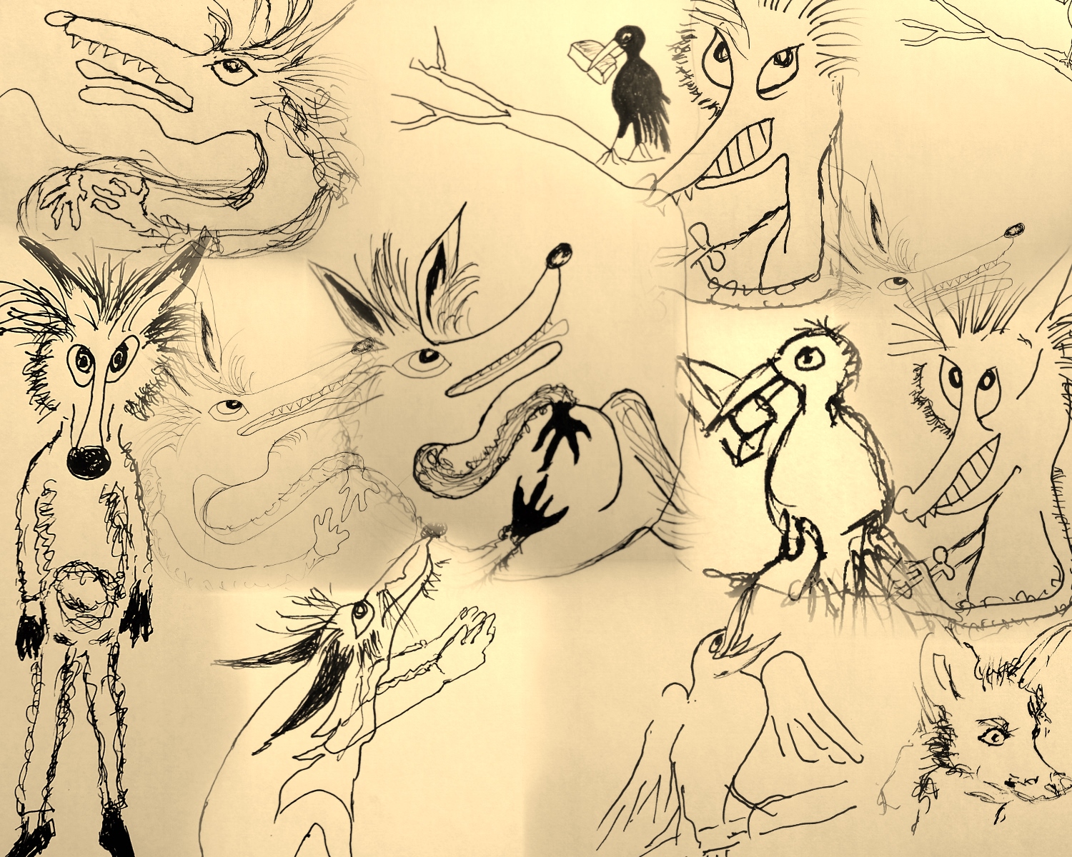 I have played with a few of my own drawings of fox and crow.