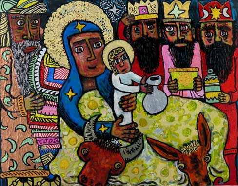 I love this painting by He Qui the Chinese artist. The characters represent for me the difference and strangeness of people of other cultures who come to visit the Christ child and bring their gifts. They and their gifts are lovingly valued and accepted.