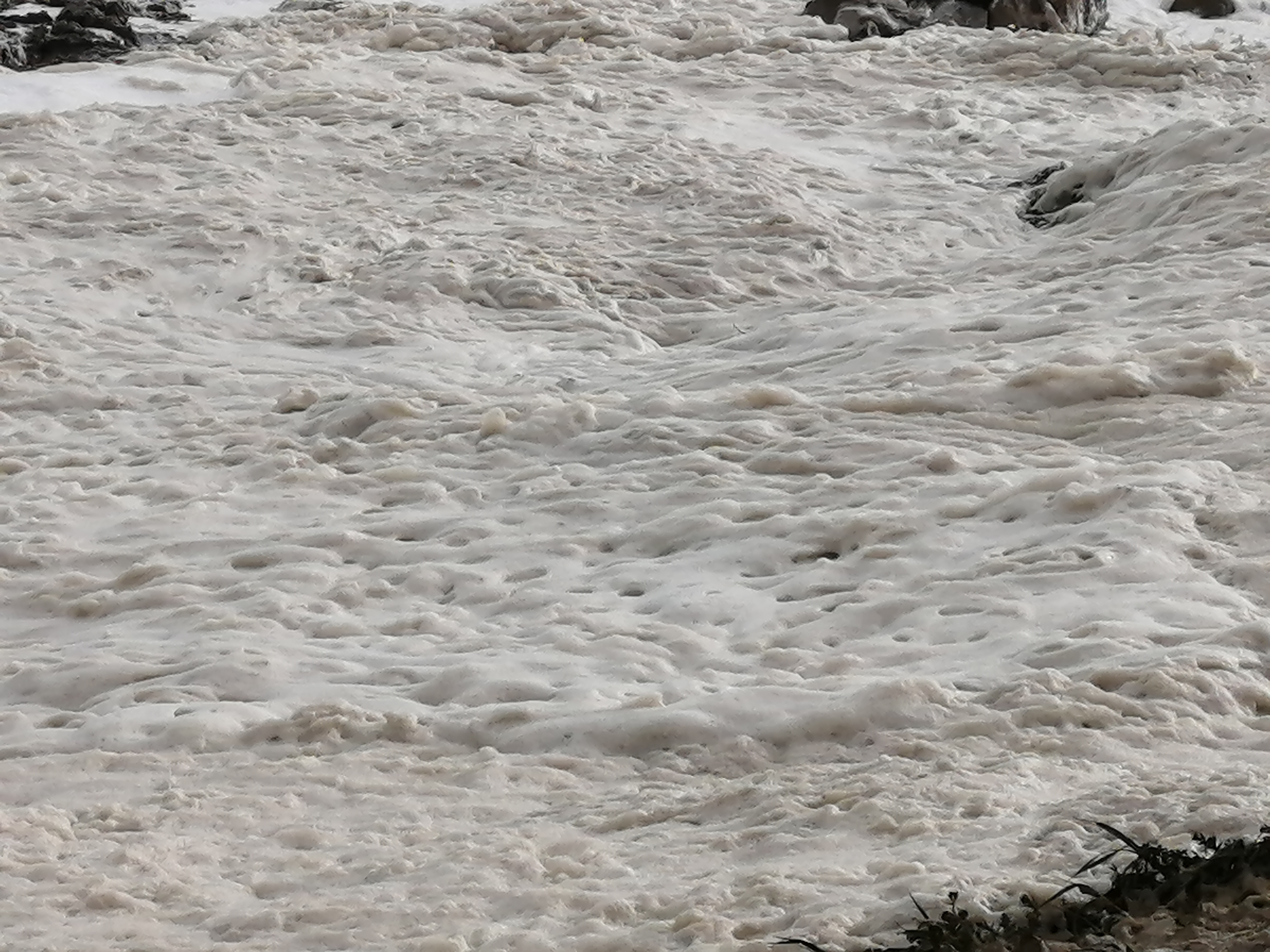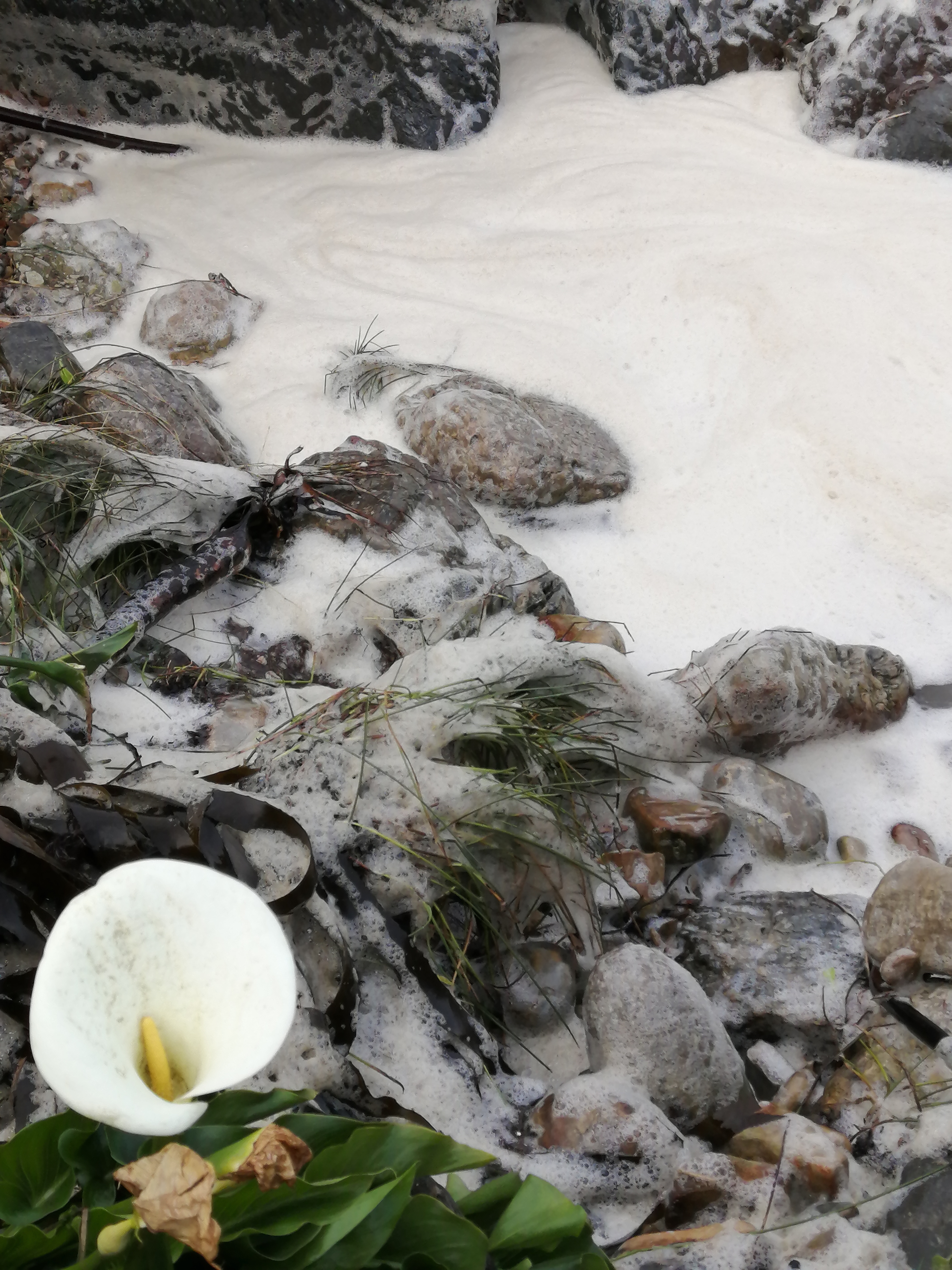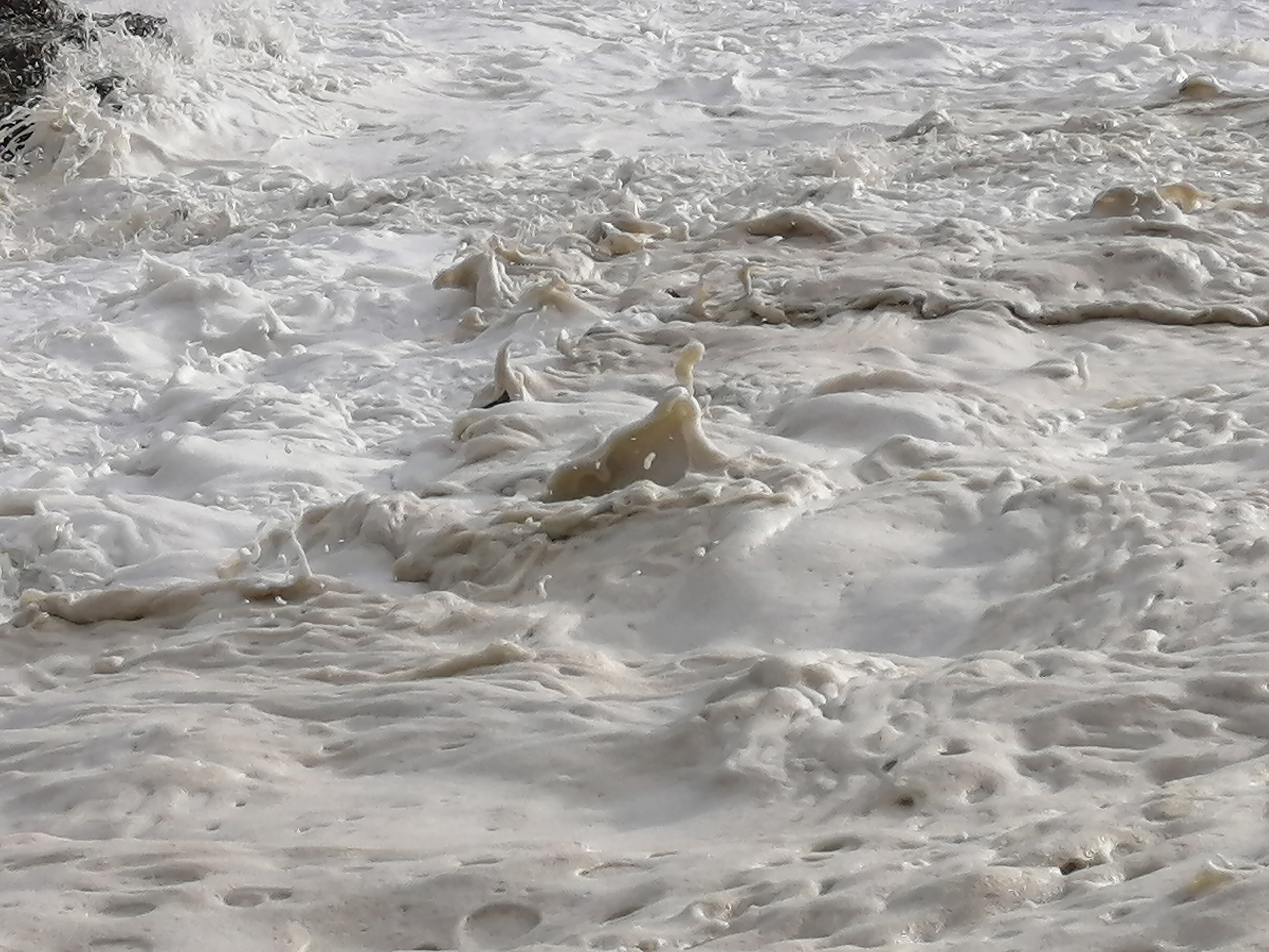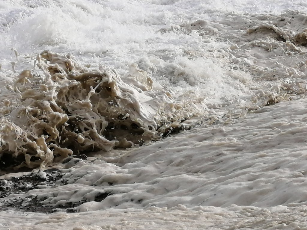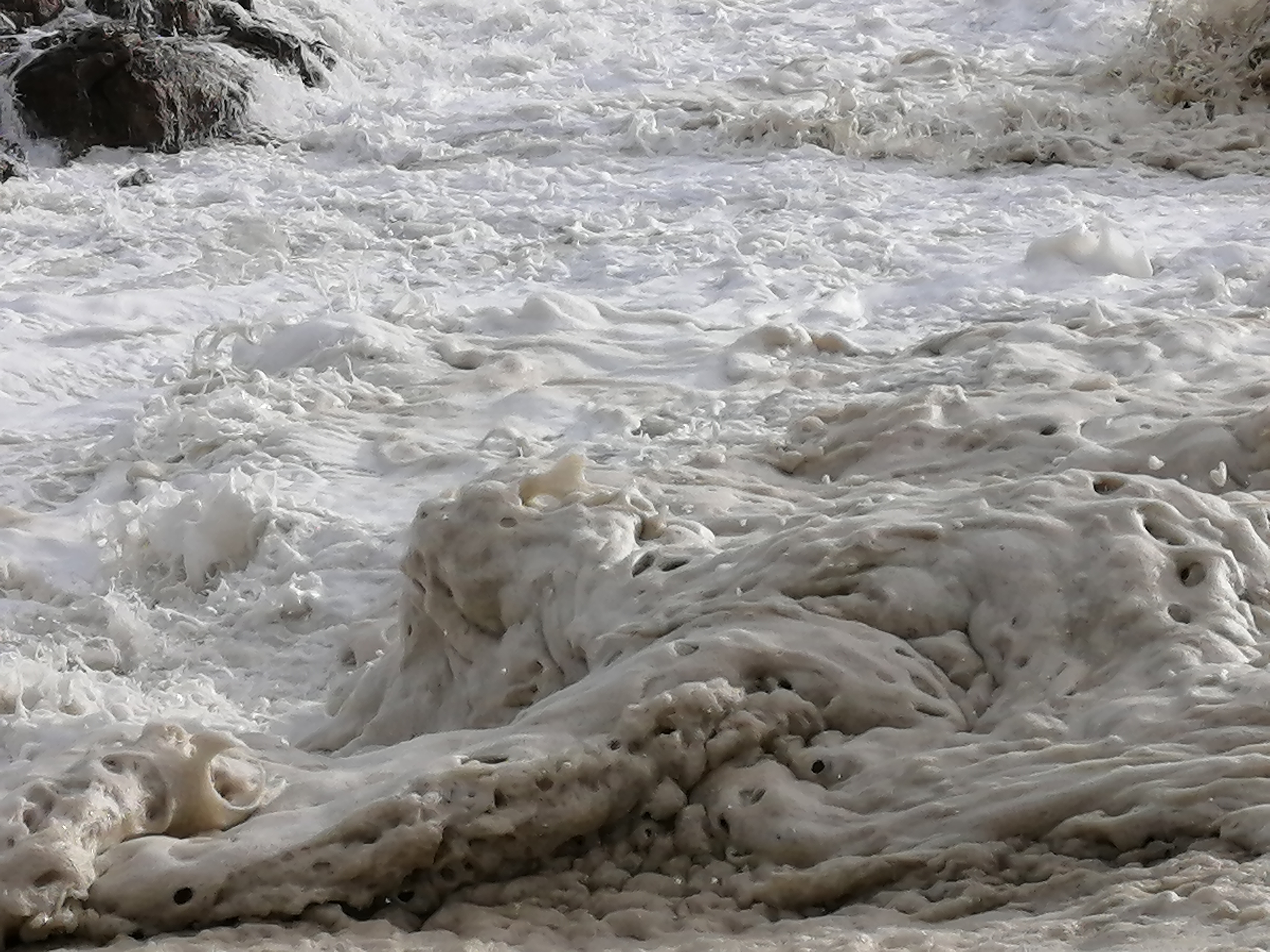 The foam is energy, forming, twisting, spiralling, rushing, groaning, crashing heaving, rolling upon itself and over itself, then raging, charging in a riotous howl, chopping and changing, restless streams of itself gather to a monstrous wave of whiteness in a violent rush of motion to cake and crash all in its way, roiling the stones in its suction so that they cry out against the heave of its inbreathing, leaving a landscape and seascape swirling in glistening snow.