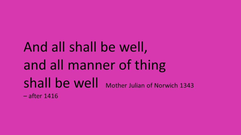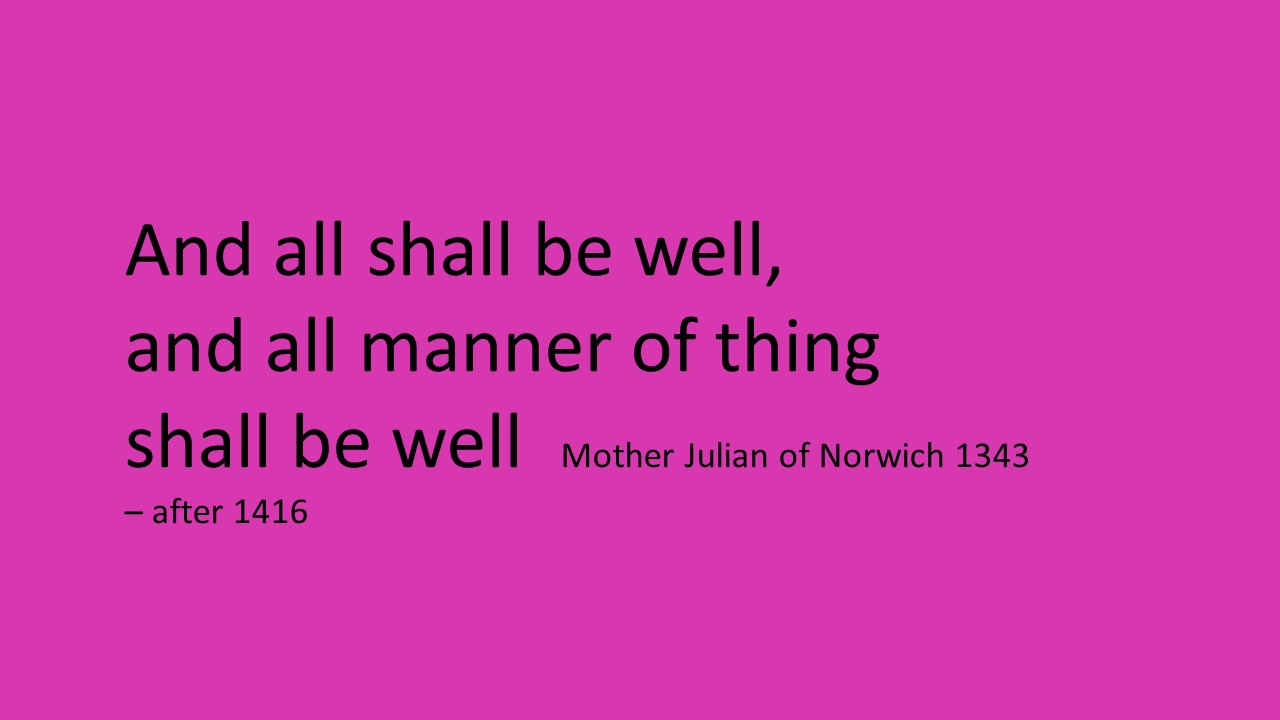 Dame Julian of Norwich was a Christian mystic who in 1373, at the age of 30 fell seriously ill, so ill that she thought she was going to die. However, in this resigned state she received a series of visions or showings of the passion of Christ. The words I have quoted comes out of her experience of suffering and illness.