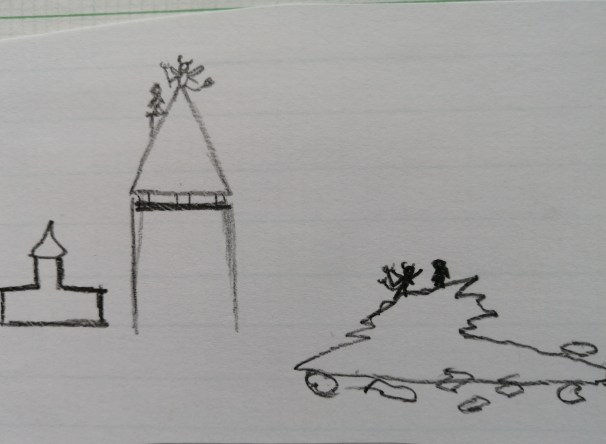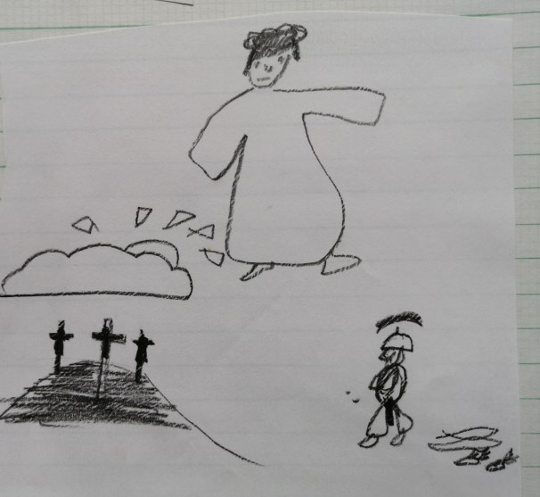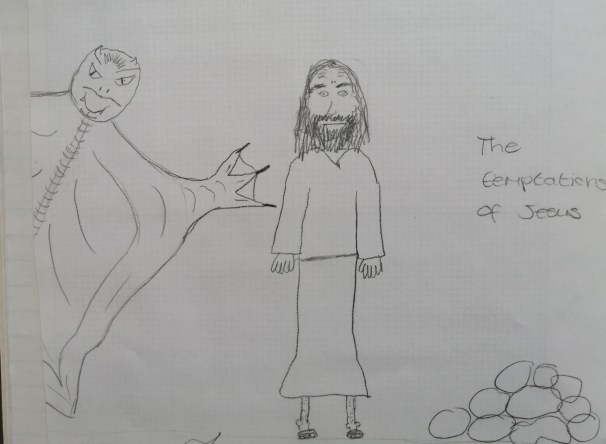 In the first image we see a very excited devil and a very calm focused Jesus. And where did this child get the image of a devil that looked like that. I certainly didn’t give it to her. There is more of a roughness to the characters in the second image. I like the tail and the bubble hint that this is the bread temptation. Jesus looks ready for a struggle. In the third image Jesus and the Devil are on the pinnacle of the temple tower where he is invited to jump down and have angels rescue him. The image is mirrored on an island close by.