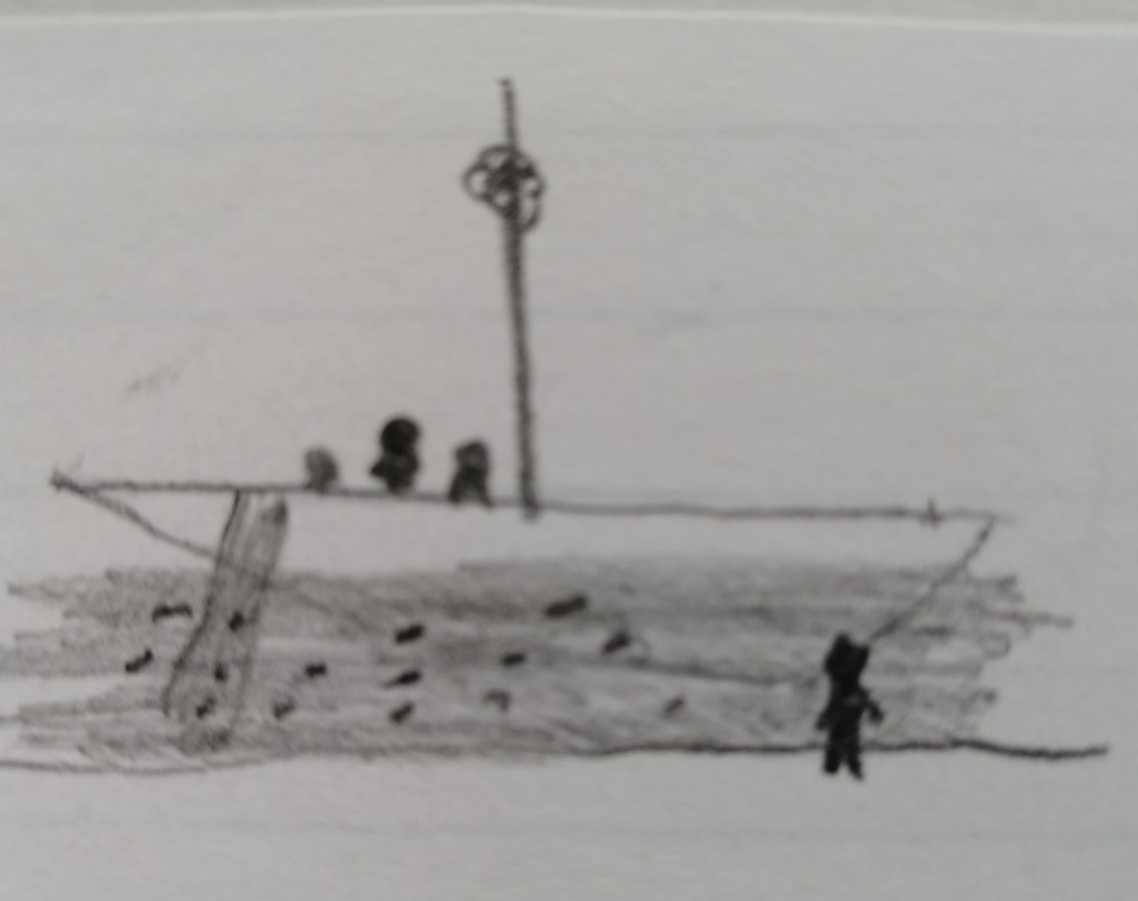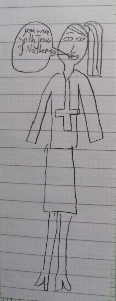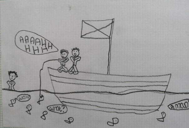 There is a windmill element to this drawing of the resurrection. The windmill beating the time, the tomb empty and Jesus risen beyond time and space. I just love the drawing of the two women and the hovering angel. I think the last image is of Jesus appearing to the disciples on the seashore.