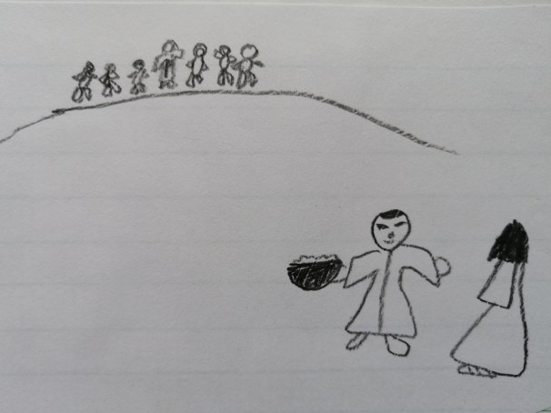 I am sure you can guess the parable. The first drawing is so beautifully conceived and presents the whole parable. This story can be acted out with a small group of children. I picked up this way of acting it out from the musical Godspel. The sower goes out and throws the seed. The seed are children who collapse into the ground. Some big children birds come and eat the seed. Chomp. Chomp. The seed on rocky group shoot up, but when a child sun comes up in the heat of the day, the children plants wither and collapse. (get them to make all the sounds) The seed among thorns grow up, tall and thin, but the weeds grow, thicker, stronger, faster. They turn and choke the seed. The seed in good soil takes root, develops root grow strong and healthy, and abundantly. Lots of smiling children, dancing in the sun.