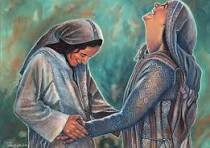 The cousins meet: The babe leaps in Elizabeth’s womb and she ecstatically cries out joyfully with the words of the first Hail Mary Prayer:
